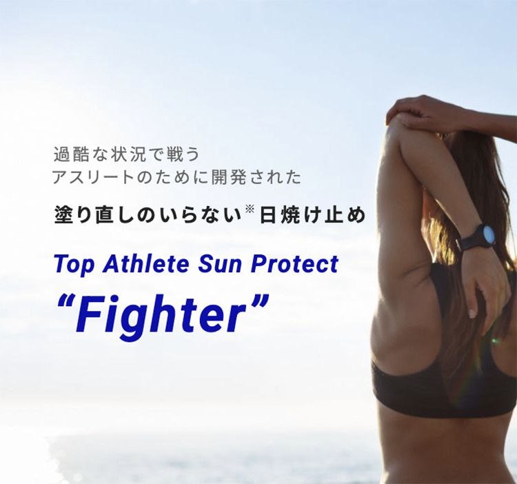 トップアスリート サンプロテクト “ファイター” は一日中「塗り直しがいらない 」ことを特長として際立たせているため、水や石けんでは落としにくいように設計されています。 落とすときはクレンジングオイルをご使用ください。